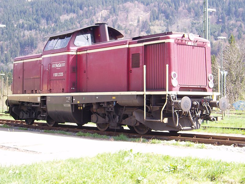 Ein Bauzug der Firma Spendo mit BR V100 2335 am 01.05.2006 in Oberstdorf